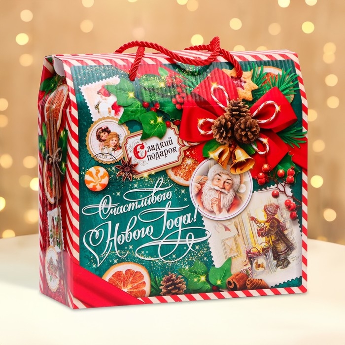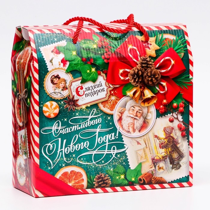 - Коробка выполнена из высококачественного картона, который не только прекрасно удерживает форму, но и гарантирует надёжность и долговечность. Ярко оформленная, она украшена красочными новогодними мотивами. Каждый элемент дизайна продуман до мелочей, чтобы создать ощущение праздника и сказки.