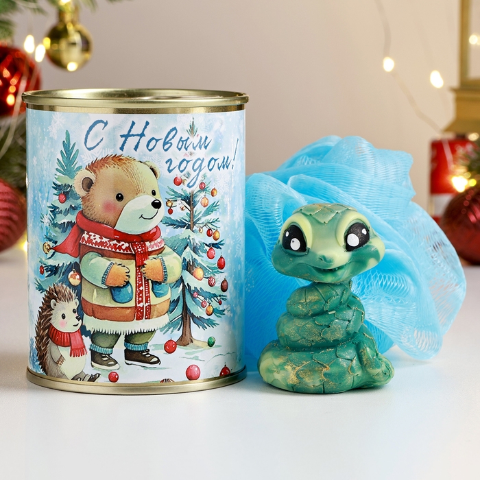 Новый год. Символ 2025. Набор в консервной банке "С новым годом!" змея мыло + мочалка
