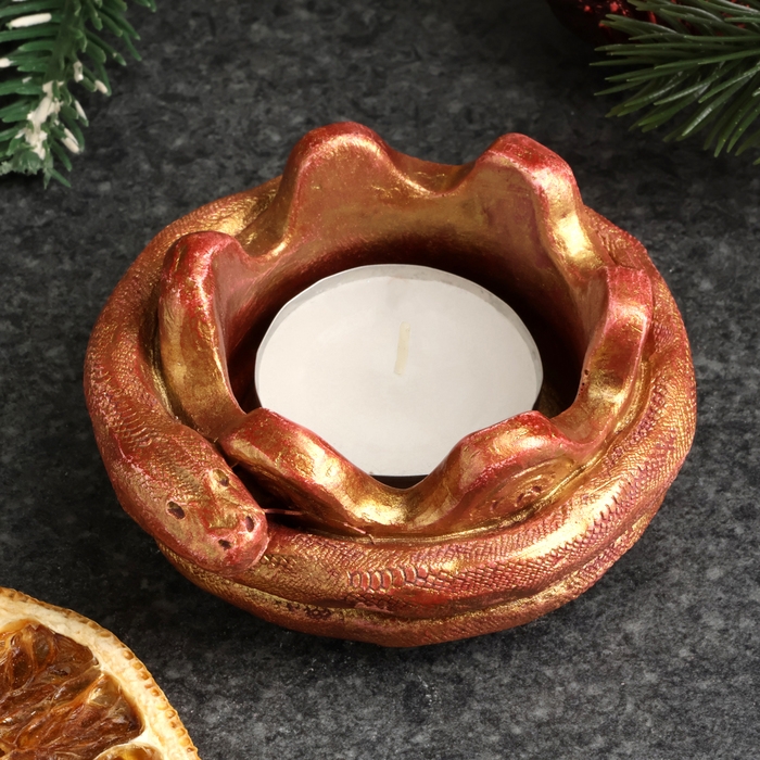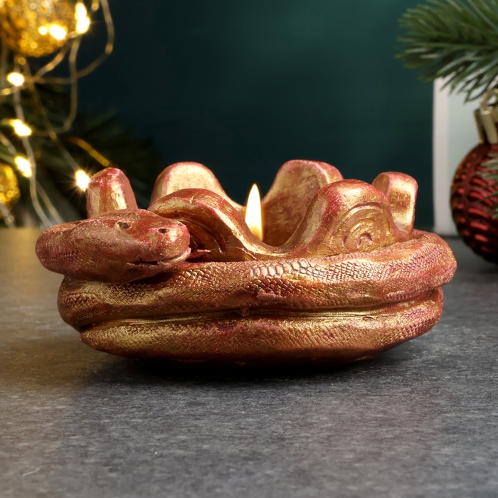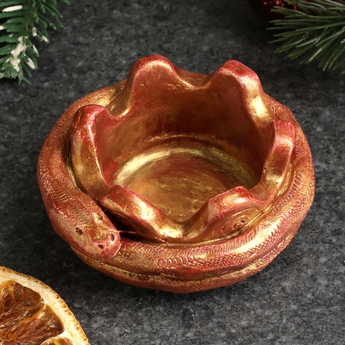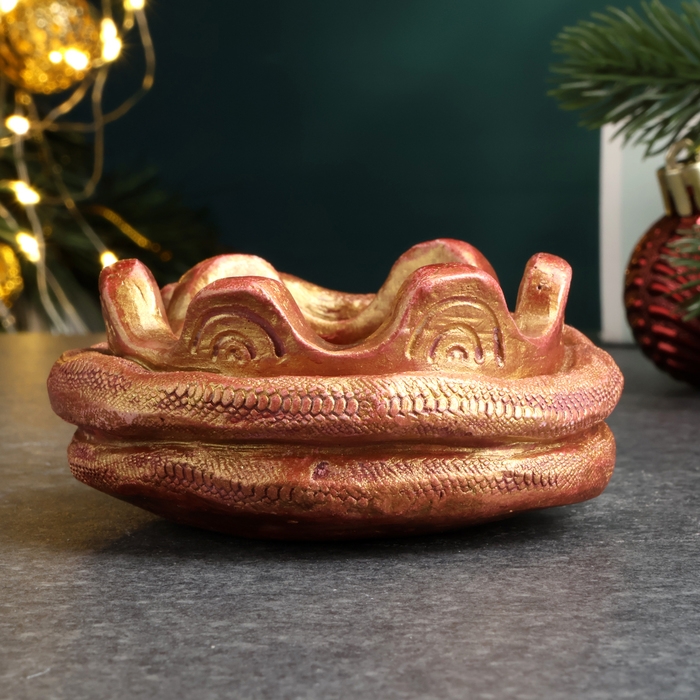Новый год. Символ 2025. Подсвечник новогодний "Змея на чаше" бордовый с позолотой, 4х10см