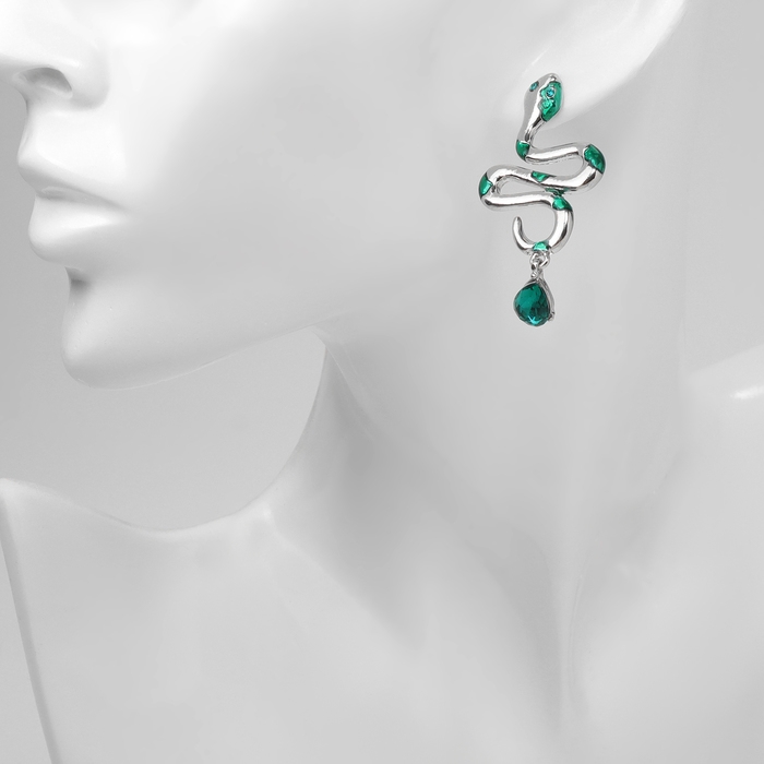 Новый год! Символ года 2025! Серьги «Змеи» с каплей, цвет зелёный в серебре