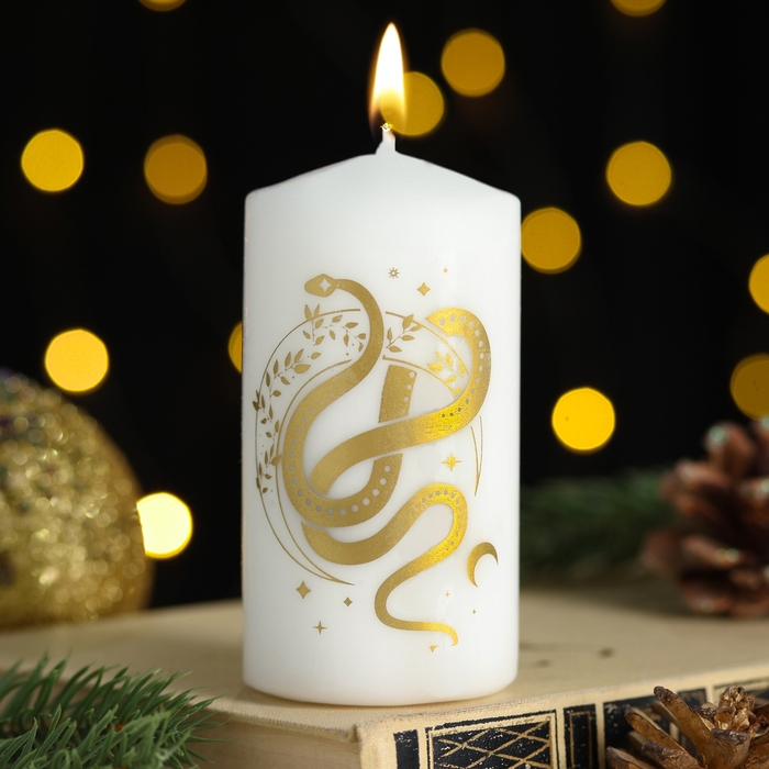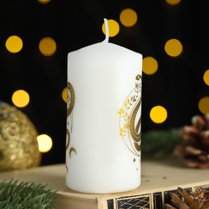 Новый год Символ года Свеча - цилиндр новогодняя, 5х10 см, белая с золотой змеёй