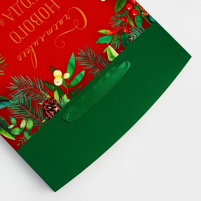 Дизайн сумки выполнен в праздничной тематике с яркими новогодними элементами, создающими атмосферу праздника и волшебства. Крышка коробки надёжно закрывает содержимое, а удобные ручки обеспечивают комфортное перенесение и делают упаковку не только красивой, но и практичной.