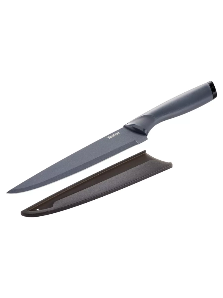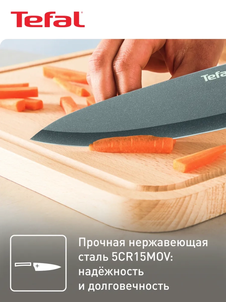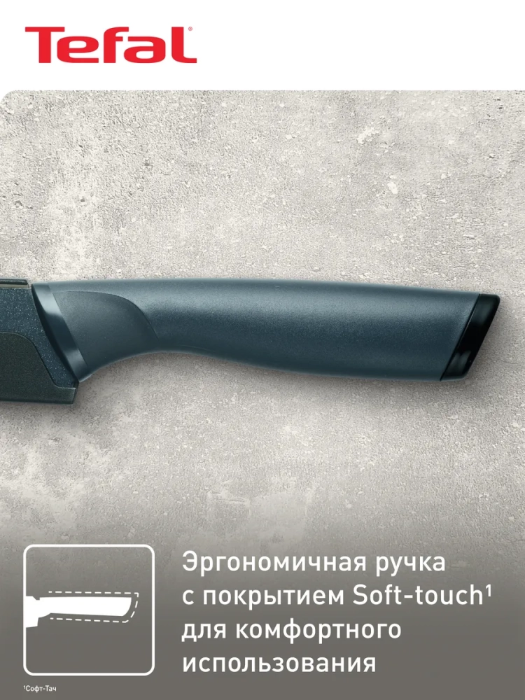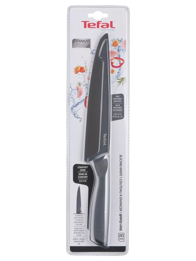 Лезвие ножа Tefal Fresh Kitchen выполнено из нержавеющей стали и имеет особое покрытие, которое не дает ингредиентам прилипать во время нарезания. Лезвие из высококачественной нержавеющей стали имеет особое титановое покрытие, которое гарантирует прочность и легкую очистку. Благодаря мягкому покрытию ручки Soft-touch нож комфортно лежит в руке, не скользит и гарантирует полный контроль во время использования.