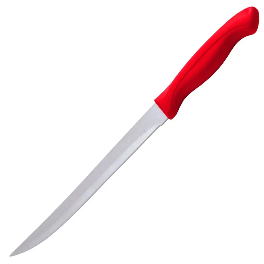 Разделочный нож — незаменимый предмет на кухне. С его помощью вы сможете разделать мясо, рыбу, полуфабрикаты, нарезать овощи и другие продукты. Такой нож пригодится не только для нарезки и разделки, с его помощью можно вскрывать упаковку. Лезвие изготовлено из коррозионностойкой (нержавеющей) стали, ручка из пластмассы. Можно мыть в посудомоечной машине. Общая длина 32 см, длина лезвия 20 см.