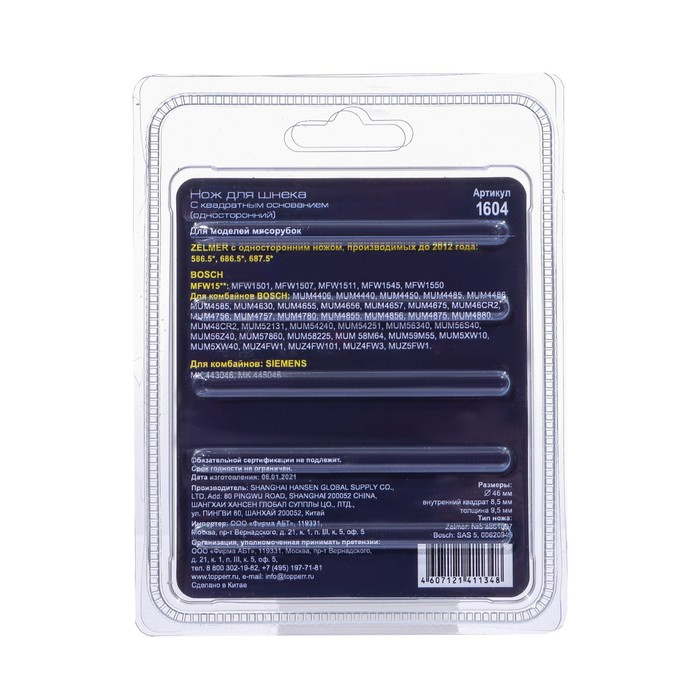 Нож с квадратным основанием Topperr для мясорубок Zelmer, Bosh, Philips