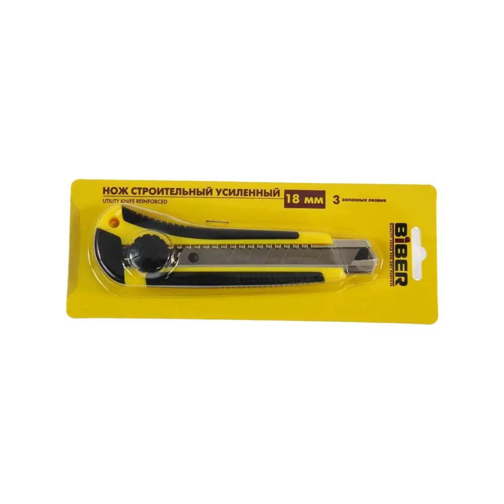 Нож технический усиленный 18 мм (обрезиненный корпус, 3 запасных лезвия), Biber