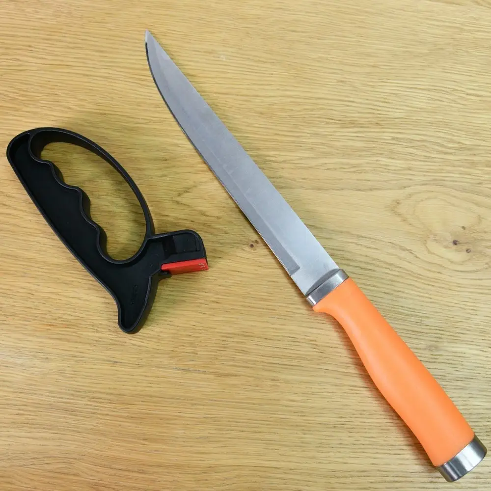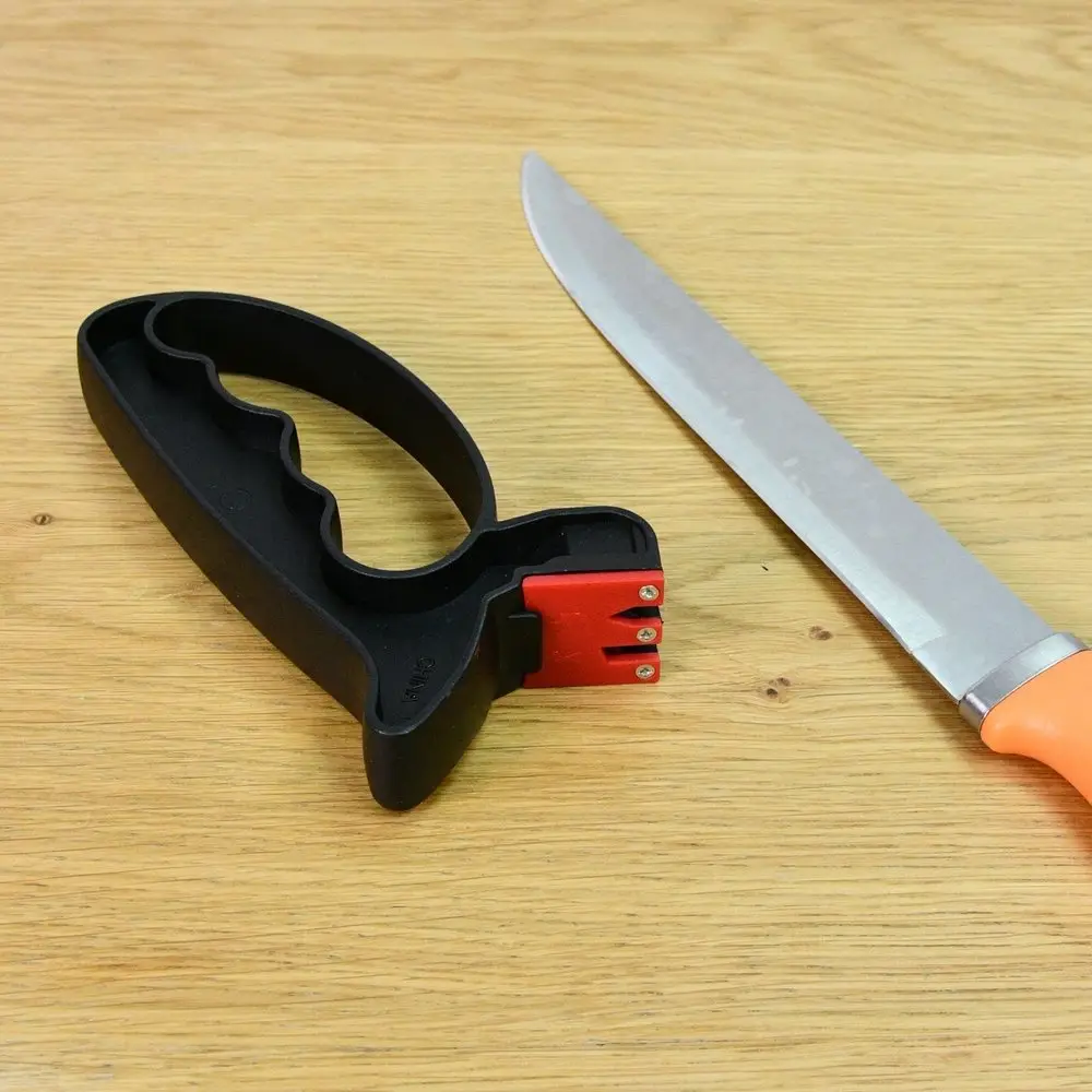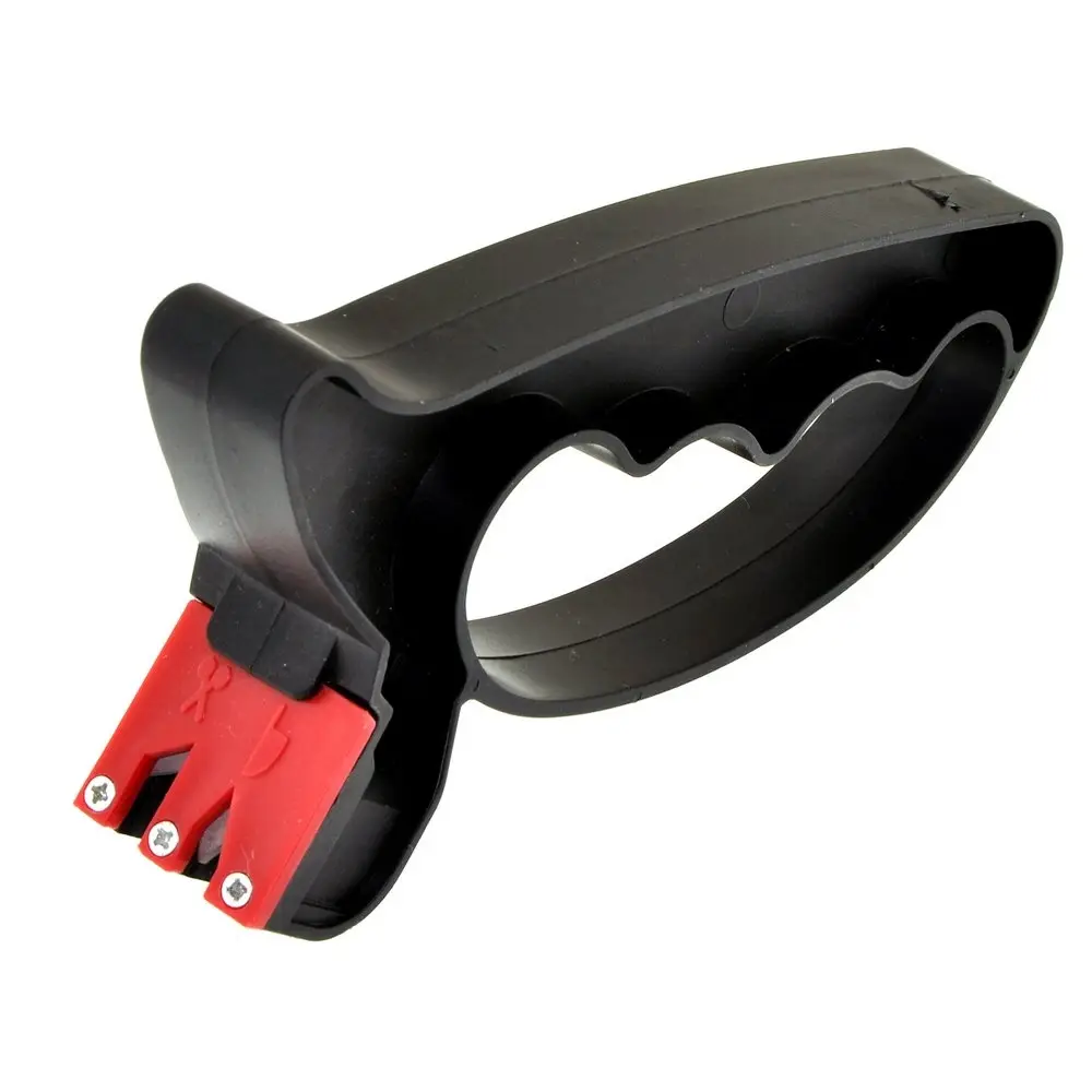 Для поддержания ножей в рабочем состоянии используйте ножеточку, предназначенную для домашнего использования. Преимущество этой модели в том, что корпус выполнен в виде ручки, обеспечивающей дополнительное удобство применения. Заточенные ножи обеспечивают удобство и безопасность применения. Ножеточка имеет две насечки — одну для ножей, вторую для ножниц. Зафиксируйте режущей кромкой вверх и проведите несколько раз ножеточкой по лезвию. Надавливайте равномерно, слишком сильное надавливание может повредить лезвие. Рабочая часть изготовлена из металлокерамики (карбида вольфрама), корпус из пластмассы (полипропилена).