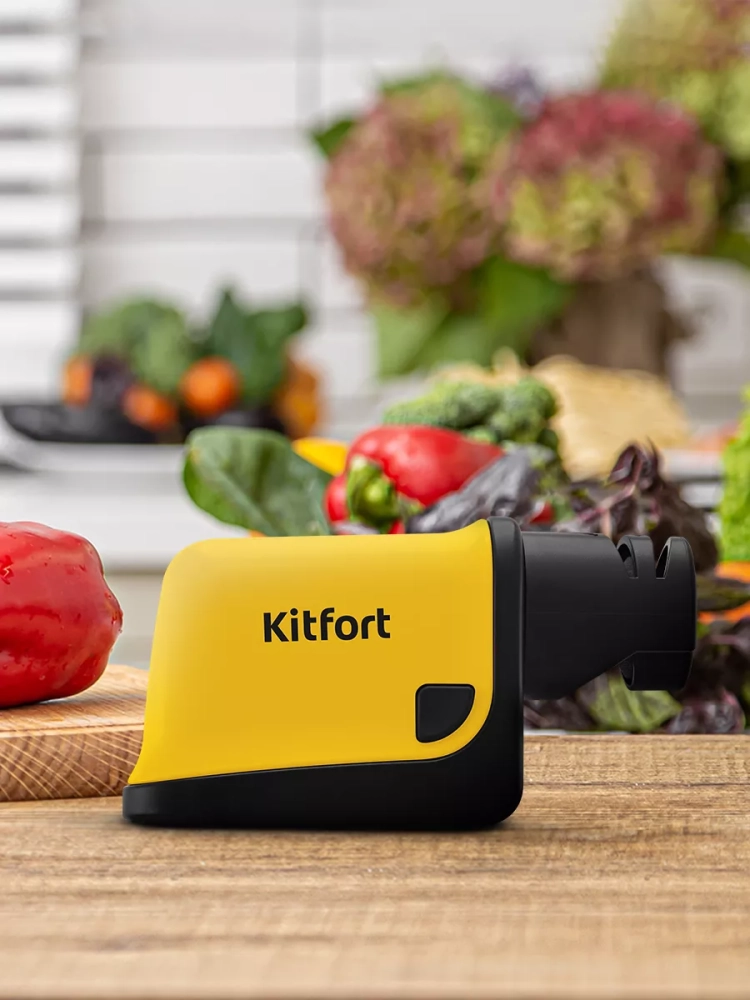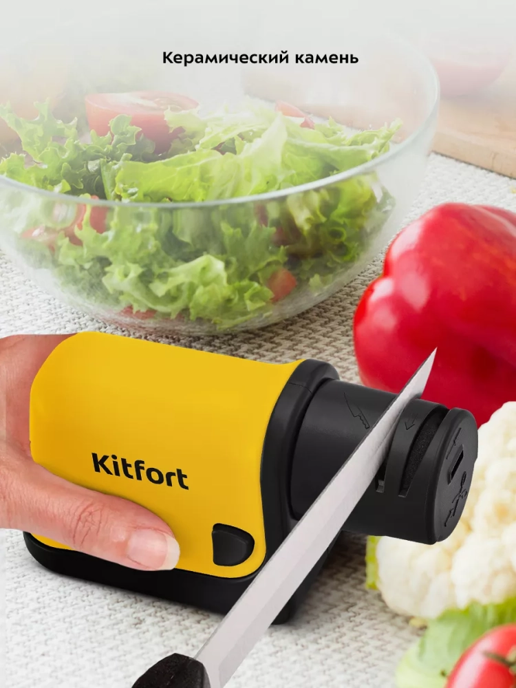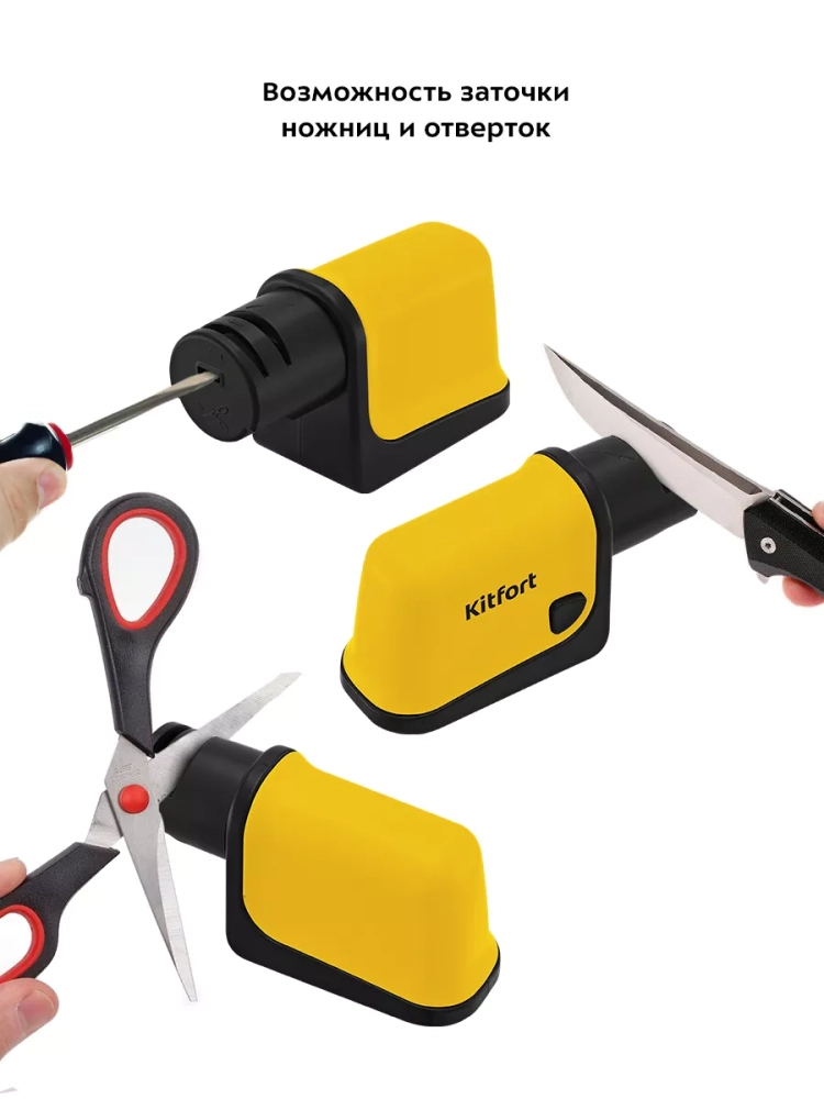 Электроточилка для ножей Kitfort КТ-4099 поможет быстро и безопасно заточить ножи с гладкими стальными лезвиями. Также данным устройством вы можете заточить ножницы и торцевать отвертки с плоским шлицем.