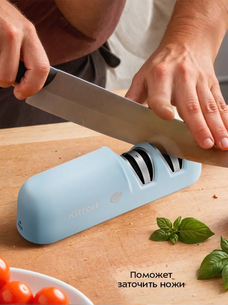 Электроточилка для ножей Kitfort КТ-6547 поможет быстро и безопасно заточить ножи с гладкими стальными или керамическими лезвиями.