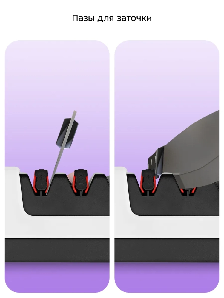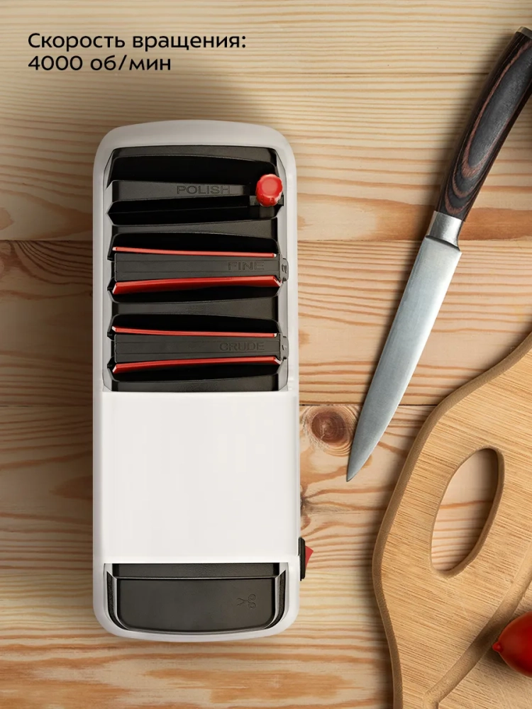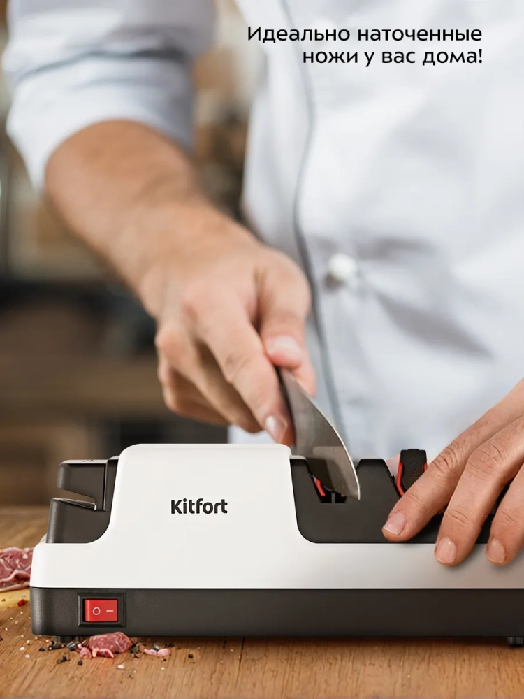 Электроточилка для ножей Kitfort КТ-6552 поможет быстро и безопасно заточить ножи с гладкими стальными или керамическими лезвиями, серрейторные ножи и ножницы.