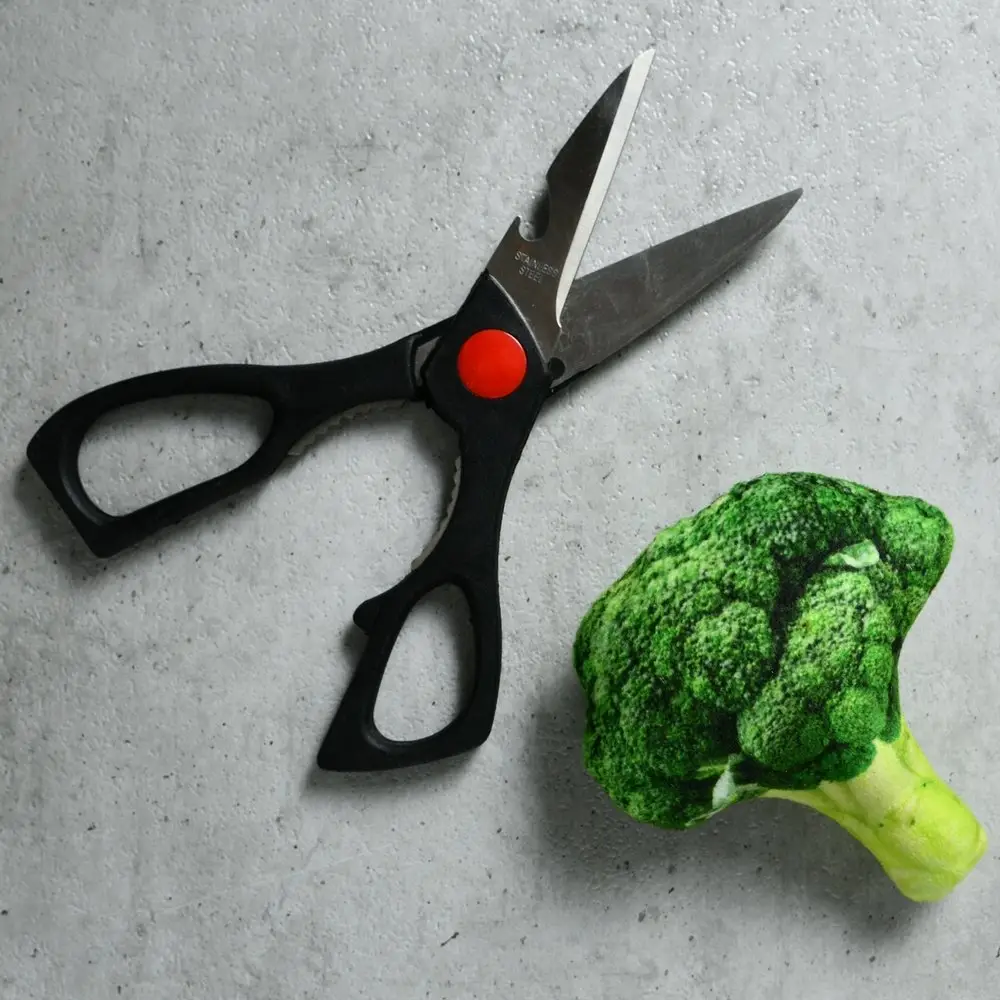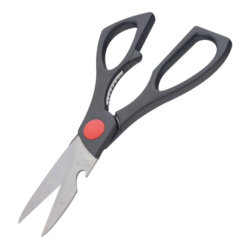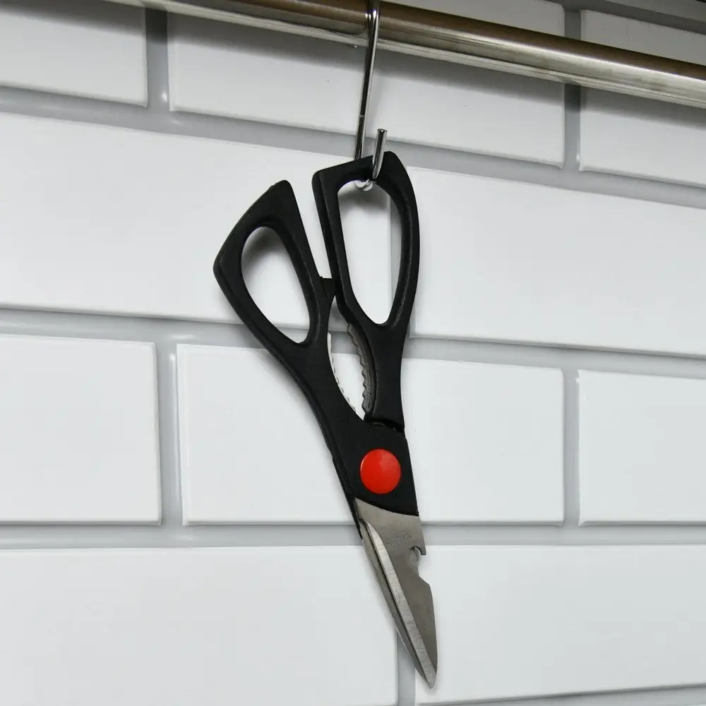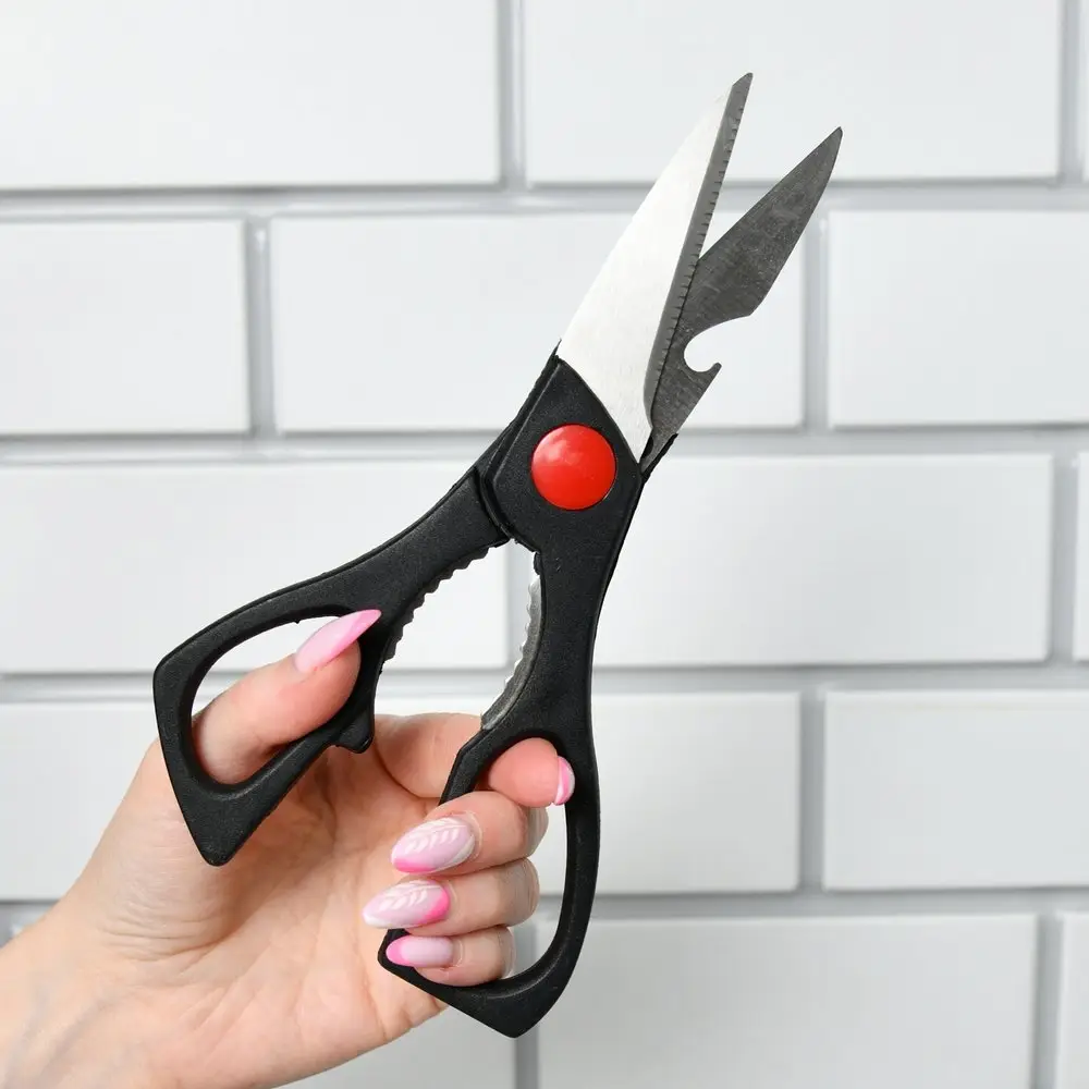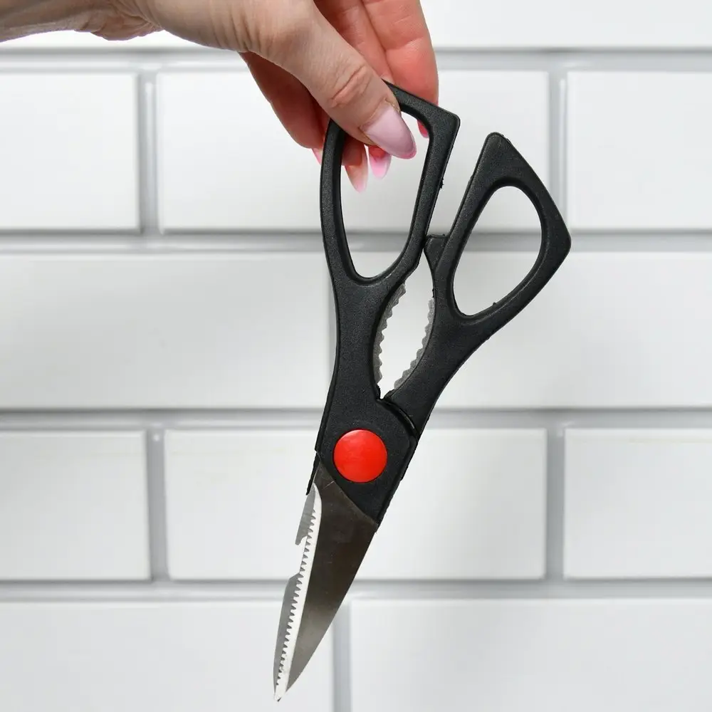 Упростить разделку продуктов помогут кухонные ножницы. Инструмент предназначен для быстрой и удобной разделки дичи, птицы, мясных продуктов, для резки зелени и вскрытия упаковки. Ножницы изготовлены из нержавеющей стали, это прочный материал, выдерживающий довольно сильные нагрузки. На лезвии есть специальная насечка для удобства открывания бутылок. Ручки изготовлены из пластмассы. После использования промывайте с жидкими моющими средствами.
