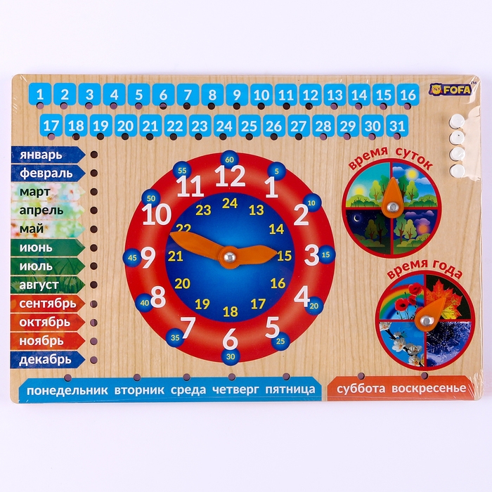 Обучающая доска «Календарь с часами. Природа» — игра познакомит малыша со временем в широком понимании этого слова, начиная от минут, заканчивая временами года.
