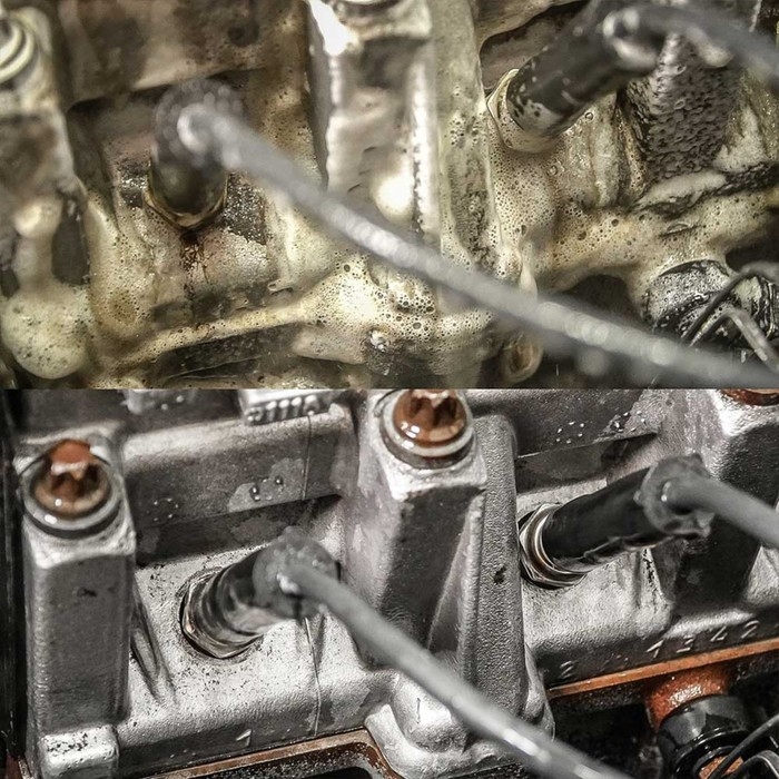 Пенный очиститель двигателя Foam разрушает и полностью удаляет сложные загрязнения: масляных пятен, тормозной жидкости, гудрона, дорожной грязи, а обильная стойкая пена помогает активным компонентам очищать самые труднодоступные места.