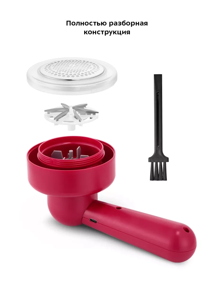 Принцип работы схож с электробритвой — защищенный металлической сеткой блок ножей срезает комки ворса с поверхности ткани. Съемный блок ножей сделан из нержавеющей стали. Комки ворса попадают в контейнер, который нужно очищать после каждого использования. В комплекте идет щеточка, которая предназначена для очистки ножей.