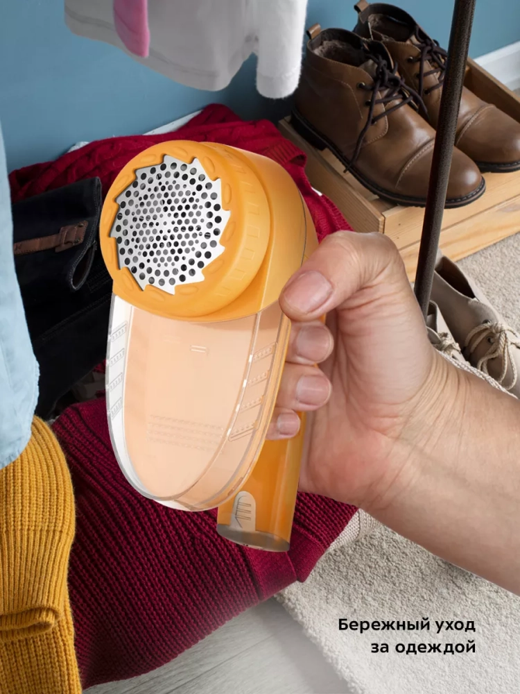 Принцип работы схож с электробритвой — защищенный металлической сеткой блок ножей срезает комки ворса с поверхности ткани. Съемный блок ножей сделан из нержавеющей стали. Комки ворса попадают в контейнер, который нужно очищать после каждого использования. В комплекте идет щеточка, которая предназначена для очистки ножей.