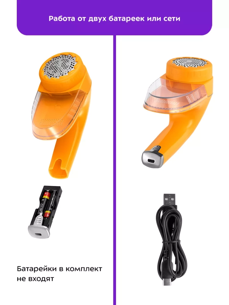 Прибор работает от двух батареек типа ААА (в комплект не входят), поэтому его можно брать с собой в путешествия или на работу. Также очиститель катышков можно подключить к электросети с помощью шнура USB Type-C. Прибор легкий, эргономичная ручка удобно лежит в руке.