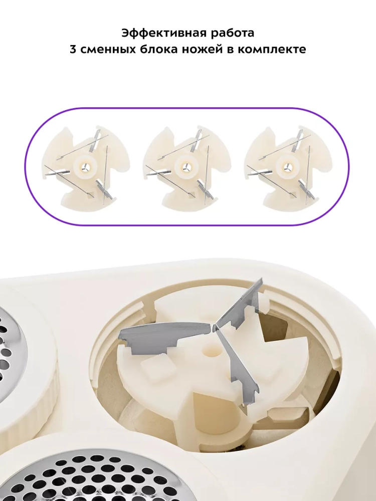 Прибор можно использовать для любых тканей из хлопка, шерсти или льна. Три скорости работы удобны для работы с разными видами тканей. Три блока ножей захватывают большую площадь ткани, поэтому удаление катышков происходит быстрее и эффективнее. В комплекте также есть три запасных блока ножей, что продлевает срок службы устройства.