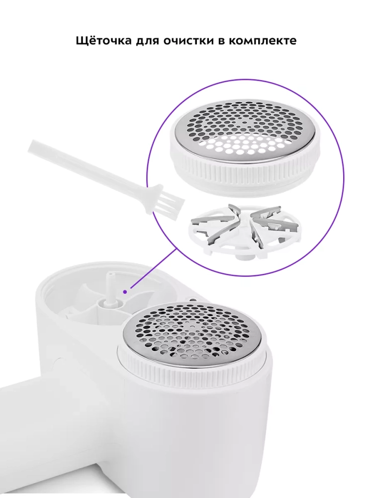 Принцип работы схож с электробритвой — защищенный металлической сеточкой блок ножей срезает комки ворса с поверхности ткани. Съемные блоки ножей сделаны из нержавеющей стали. Комки ворса попадают в контейнер, который надо периодически очищать. В комплекте идет щеточка для чистки.