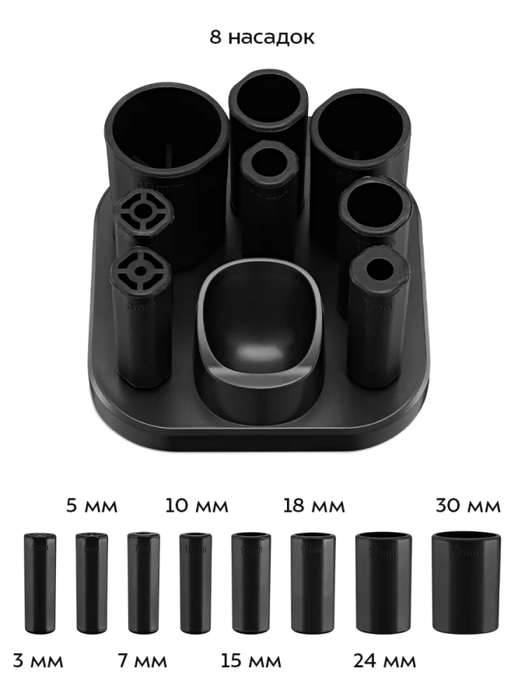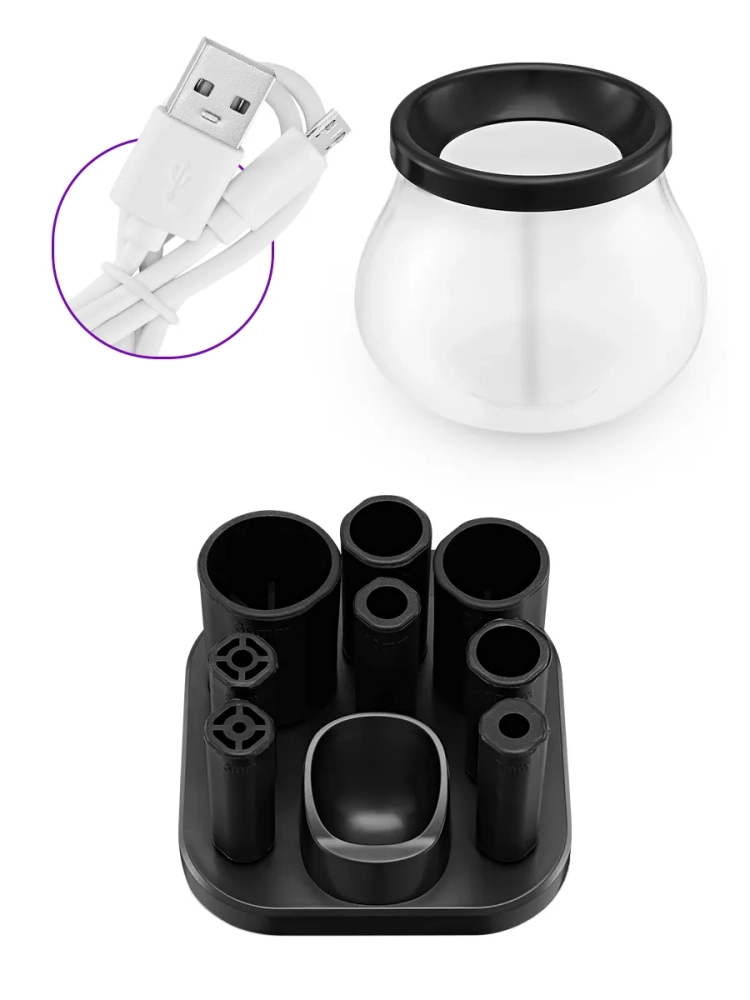 В комплекте с прибором идут 8 насадок разного размера, которые подходят для различных кистей. Насадки и прибор хранятся на подставке, благодаря чему прибор будет всегда под рукой. Очиститель кистей работает от аккумулятора — вы сможете проводить очистку кистей в любом удобном для вас месте, и даже брать прибор в поездки.