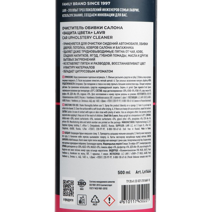 Очиститель обивки LAVR, триггер, 500 мл Ln1464