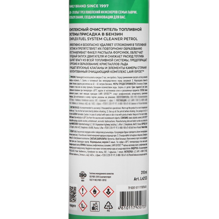 Очиститель топливной системы бензиновых двигателей LAVR, на 40-60 л, 310 мл, Ln2123