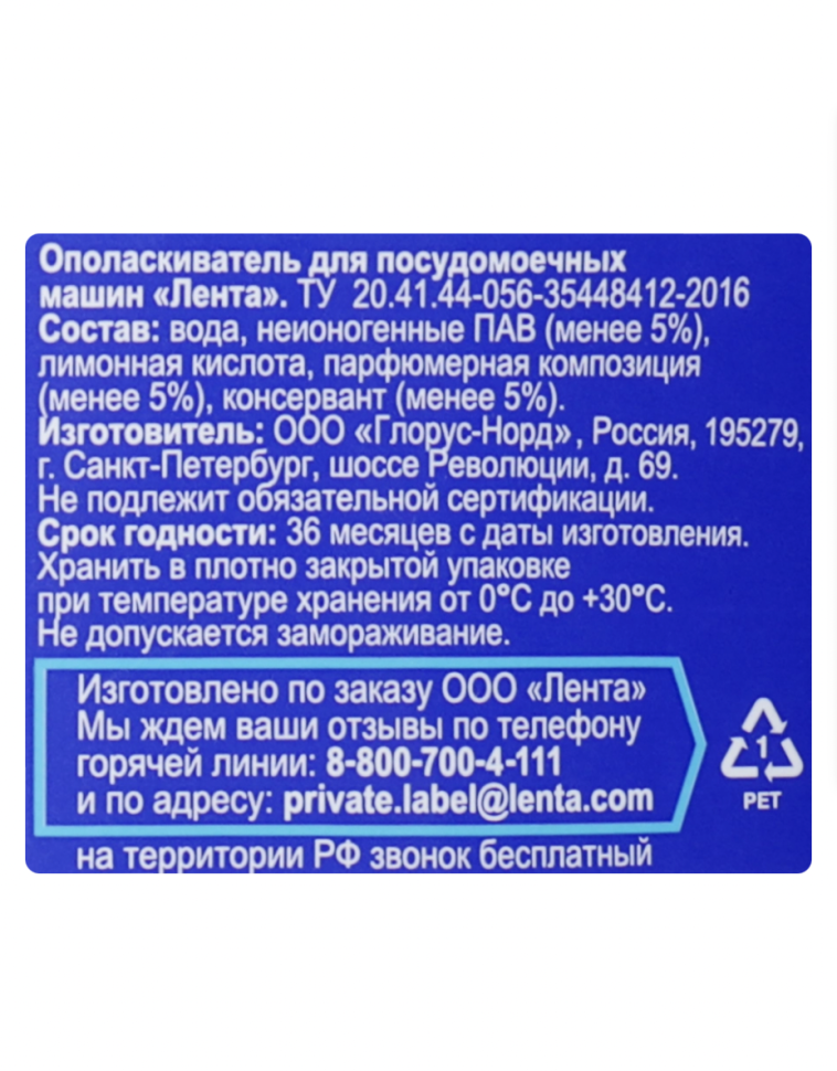 Ополаскиватель для посудомоечной машины ЛЕНТА, 500мл Способ применения, дозировка Залить ополаскиватель в специальный отсек посудомоечной машины до метки (см. инструкцию к посудомоечной машине), добавить моющее средство и пользоваться машиной как обычно. Информация для аллергиков При повышенной чувствительности и повреждениях кожи избегать длительного контакта с любыми средствами для мытья посуды. Производитель ООО «Глорус-Норд» Меры предосторожности Избегать попадания в глаза, в рот и на поврежденные участки кожи. В случае попадания обильно промыть водой. При необходимости обратиться к врачу. Не употреблять внутрь. Условия хранения При температуре от 0 до +30 в плотно закрытой упаковке, не допускать замораживания. Вид упаковки Пластиковая бутылка. Ополаскиватель для посудомоечной машины ЛЕНТА придает посуде сияющий блеск, удаляет остатки моющих средств, сокращает время сушки, предотвращает образование разводов и известкового налета на посуде. Также обладает легким цитрусовым ароматом. Состав: Вода деионизированная, неионогенные ПАВ (менее 5%), лимонная кислота, парфюмерная композиция, консервант.