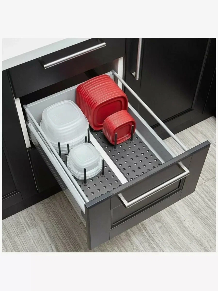 Раздвижной кухонный органайзер очень удобная подставка для посуды, тарелок, крышек, кастрюль и сковородок. Незаменимая вещь для тех, кто хочет сэкономить пространство и навести порядок в кухонных шкафах. Органайзер для крышек имеет раздвижную и удобную конструкцию, которая может трансформироваться. Длина раздвигается от 40 до 54 см. Отсеки-перегородки со специальными выемками для удобного расположения посуды. Держатель для кухонных принадлежностей отлично подойдет для тарелок, сковородок, крышек и кастрюль, а также прекрасно поместят доски, глубокие тарелки и другую кухонную утварь. Функциональная подставка станет незаменимым помощником на современной кухне. Она не только отлично экономит пространство, но и надежно защищает принадлежности от сколов и царапин. Держатель для крышек на кухню - надежная фиксация посуды в шкафу, ящике или на столе. Длина регулируется от 30 до 56 см, а прочный ABS пластик выдержит большой вес. Подставку для крышек можно хранить на столешнице, в шкафу или в выдвижной полке. Прекрасно подходит для установки в ящик.