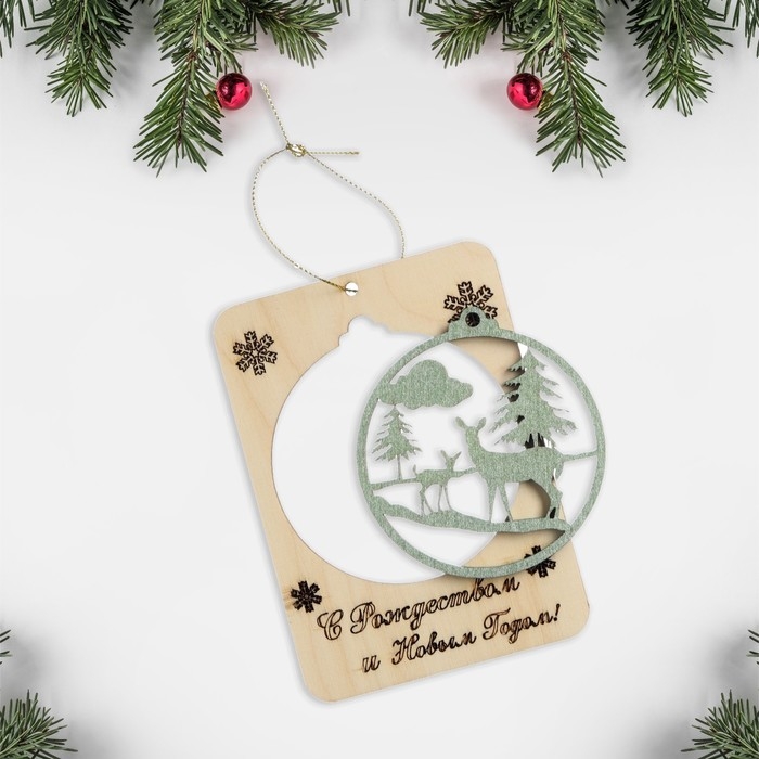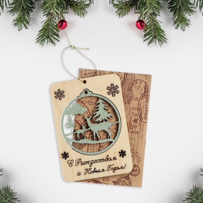 Открытка деревянная "С Рожеством и Новым Годом!" олени 8,2 х 11,5