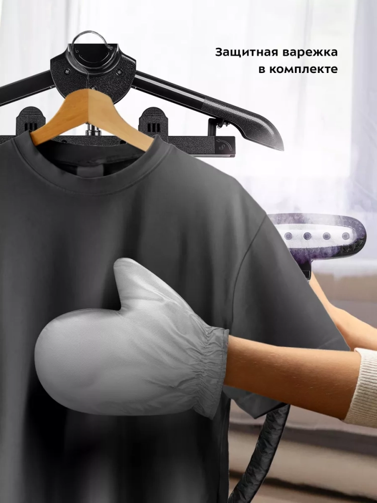На вешалку отпаривателя можно повесить рубашки, брюки и другую одежду. Также одежду можно подвесить на крючок отпаривателя, чтобы не перевешивать ее с вешалок, на которых она хранится в шкафу. В комплекте к отпаривателю идет ворсовая щетка-зажим, которая поможет счистить волосы и шерсть домашних животных с одежды и обивки мебели, а также поможет создать стрелки на брюках.