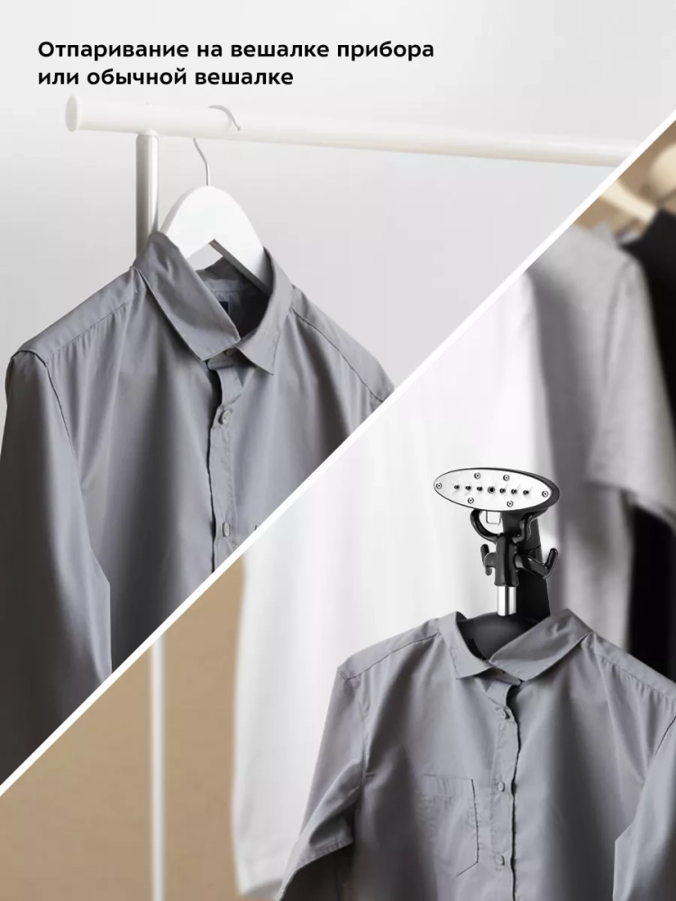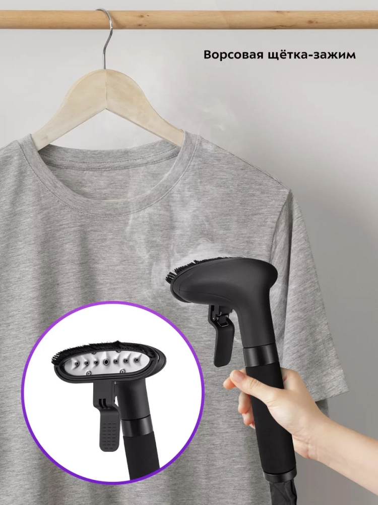 На вешалку отпаривателя можно повесить рубашки и другую одежду. Также одежду можно подвесить на крючки держателя утюжка, чтобы не перевешивать ее с вешалок, на которых она хранится в шкафу. В комплекте к отпаривателю идет ворсовая щетка-зажим, которая поможет счистить волосы и шерсть домашних животных с одежды и обивки мебели, а также поможет создать стрелки на брюках.