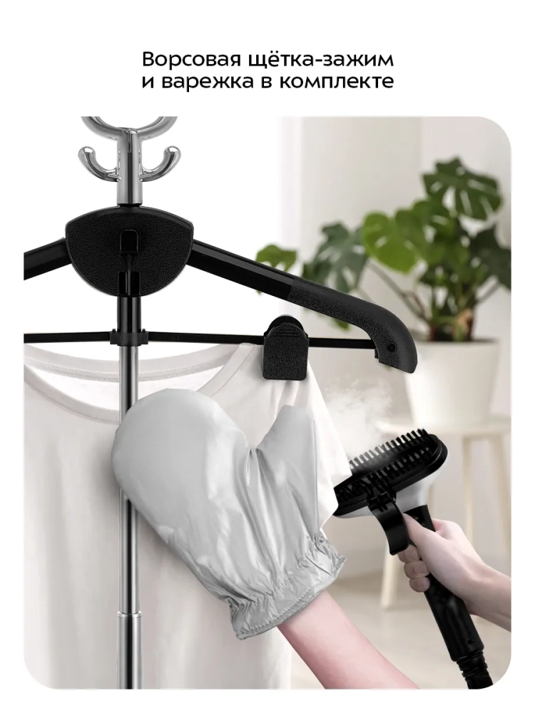 В комплекте есть защитная варежка, которая может избежать ожогов при отпаривании, и ворсовая щетка-зажим, которая поможет счистить волосы и шерсть домашних животных с одежды и обивки мягкой мебели. Щетку-зажим можно использовать для создания стрелок на брюках.