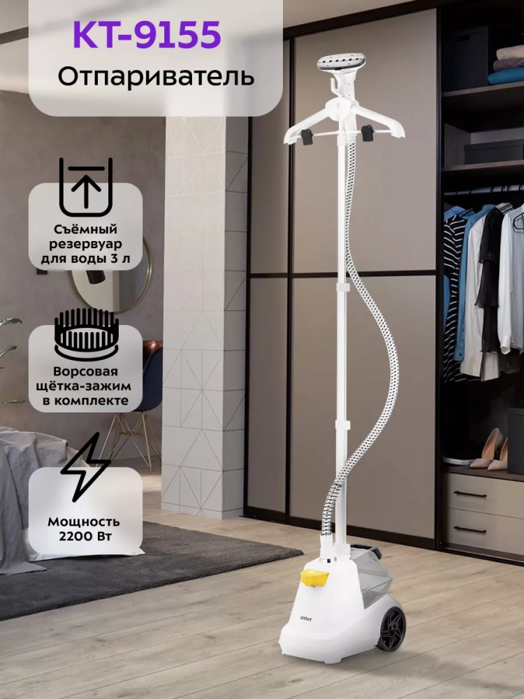 Вертикальный отпариватель Kitfort КТ-9155 — серьезный конкурент паровых утюгов: он позволяет чрезвычайно быстро прогладить любые вещи и изделия из текстиля. Это тщательный уход за вещами, не отнимающий много времени.