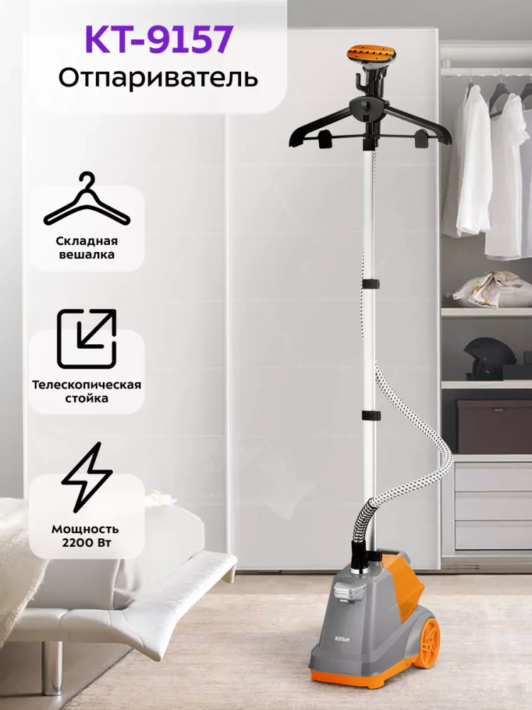Вертикальный отпариватель Kitfort КТ-9157 — серьезный конкурент паровых утюгов: он позволяет чрезвычайно быстро прогладить любые вещи и изделия из текстиля. Это тщательный уход за вещами, не отнимающий много времени.