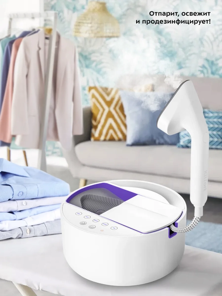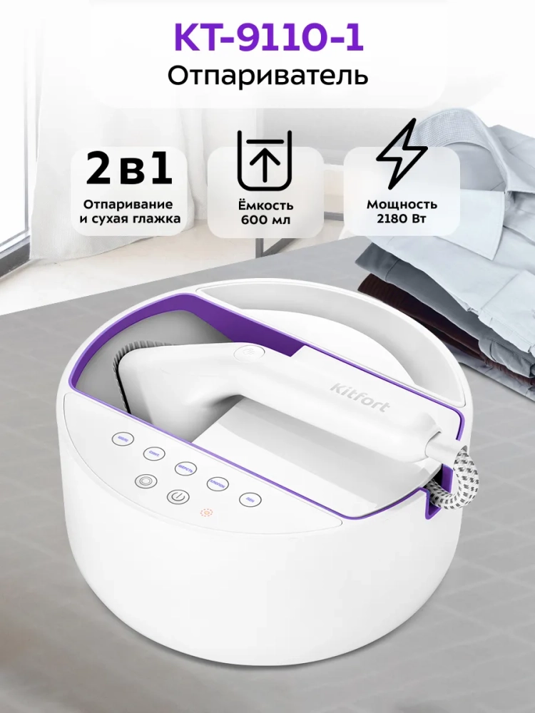 Отпариватель - устройство для разглаживания изделий из текстиля с помощью потока горячего пара. Отпариватель Kitfort КТ-9110 позволяет быстро прогладить любые вещи и изделия из текстиля. Быстрый разогрев отпаривателя поможет провести тщательный уход за вещами, не отнимающий много времени. Отпариватель - серьезный конкурент паровых утюгов и более функциональное и универсальное устройство, чем утюг. Под действием пара волокна ткани не растягиваются и не сжимаются, как под воздействием утюга, а приобретают объемность и эластичность. Отпариватель не деформирует ткани и не оставляет заломов или лоснящихся пятен на одежде. Помимо отпаривания одежды, вы можете отпарить занавески и портьеры (для этого их не обязательно снимать), обивку мягкой мебели, матрасы или мягкие игрушки. При этом вы не только разгладите складки и вернете форму вещам, но и освежите и продезинфицируете их, так как горячий пар хорошо убивает пылевых клещей и другие микроорганизмы. Благодаря мощному потоку пара отпариватель позволяет разгладить даже те вещи, которые обычно не гладят - пышные платья со сложной структурой, шубы, дубленки или куртки. Также с его помощью можно готовить к сезону вещи, у которых при хранении появился затхлый запах - отпариватель эту проблему решает без всякой стирки. Горячий пар устраняет неприятные запахи и освежает ткани, поэтому он отлично поможет в ситуации, когда вы один раз надевали вещь и хотите сделать это еще раз, не стирая ее. Если вы находились в помещении, полном сигаретного дыма, и одежда пропахла табаком, то с помощью отпаривателя можно быстро убрать запах и освежить ее. Отпариватель КТ-9110 имеет 5 уровней подачи пара для самых разных видов тканей.