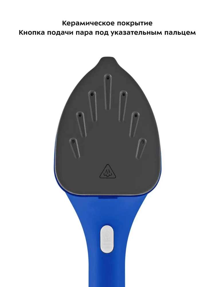 Рабочая поверхность, по форме напоминающая утюг, разгладит ткань даже в труднодоступных местах, например, рядом с пуговицами. Кнопка подачи пара расположена на ручке, поэтому ее удобно нажимать и удерживать при использовании отпаривателя.