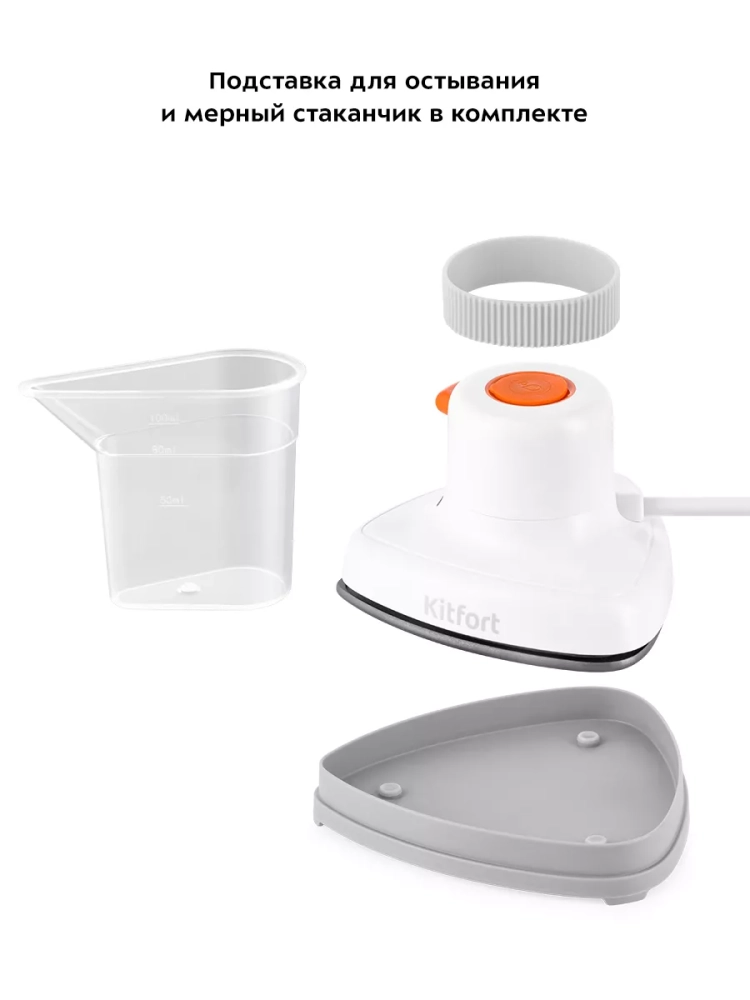 В комплекте к устройству идет мерный стакан для удобного наполнения резервуара и подставка с термозащитными вставками, на которую можно установить горячий отпариватель, чтобы избежать возможных ожогов и порчи поверхности, на которой он лежит.