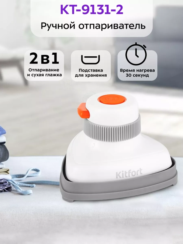 Ручной отпариватель Kitfort КТ-9131 предназначен для разглаживания изделий из текстиля с помощью потока горячего пара. Устройство обладает такими достоинствами, как мощный поток пара, минималистичный дизайн, компактность и легкий вес. Его удобно брать с собой в путешествие — устройство не займет много места.