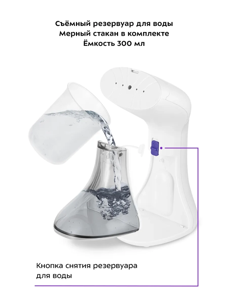 В комплекте к отпаривателю поставляются мерный стакан для удобного добавления воды и ворсовая насадка, которая позволяет почистить вещь от пыли, волос или шерсти при отпаривании.