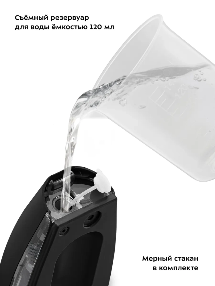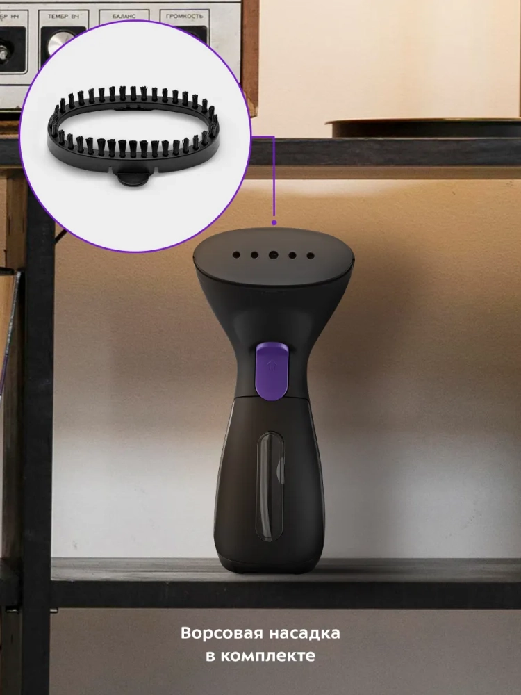 В комплекте к отпаривателю поставляются мерный стакан для удобного добавления воды в резервуар и ворсовая насадка, которая позволяет почистить вещь от пыли, волос или шерсти при отпаривании.