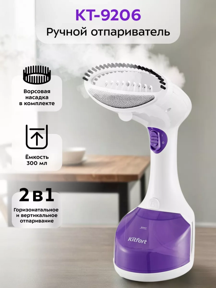 Ручной отпариватель Kitfort КТ-9206 предназначен для разглаживания изделий из текстиля с помощью потока горячего пара. Устройство обладает такими достоинствами, как мощный поток пара, минималистичный дизайн, удобство при использовании и хранении. Его можно брать с собой в дорогу — устройство не займет много места. Ручной отпариватель приведет в порядок вещи быстро и практически в любом месте — без раскладывания гладильной доски. Одежда при этом может висеть на вешалке, сушилке для белья или веревке.