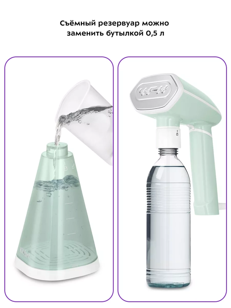 В комплекте также идет специальный переходник для бутылки, который позволяет использовать отпариватель с бутылками вместо резервуара для воды. Переходник подходит для бутылок с внутренним диаметром горлышка 21–21,7 мм и 24,4–25 мм. Для использования подойдут бутылки для воды объемом 0,5 л, которые вы можете купить в любом магазине. Например, это удобно в поездках: не нужно везти с собой резервуар. Вы можете использовать бутылку большего объема, чем резервуар, когда вам необходимо отпарить много вещей.