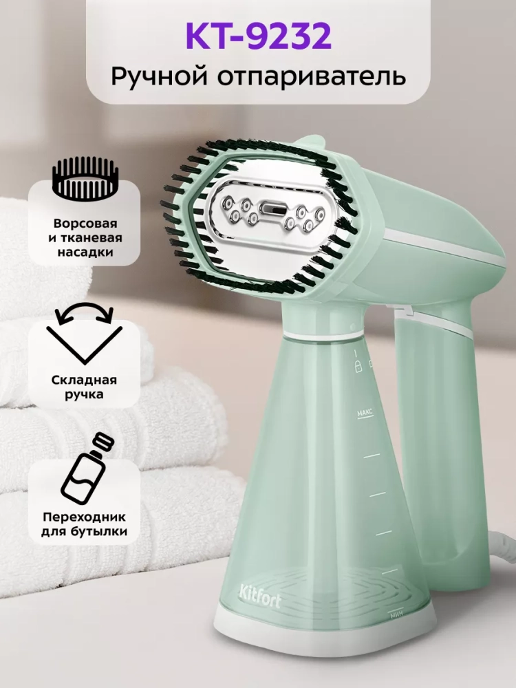 Подача пара в отпаривателе КТ-9232 осуществляется с помощью одной кнопки. У прибора два уровня подачи пара. В комплекте предусмотрены мерный стакан и 2 насадки. Ворсовая насадка поможет очистить вещи от ниток и шерсти домашних животных. Тканевая насадка сделает процесс отпаривания деликатных тканей более безопасным, а также может помочь очистить вещи от пыли.