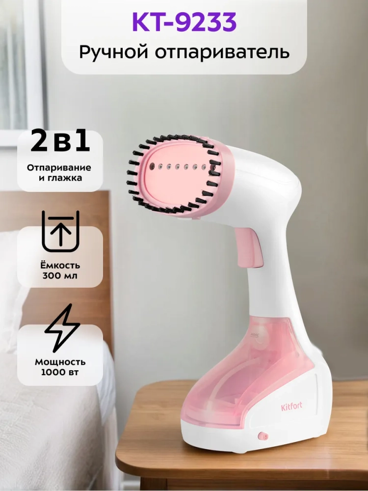 Ручной отпариватель Kitfort КТ-9233 предназначен для разглаживания изделий из текстиля с помощью потока горячего пара. Устройство обладает такими достоинствами, как мощный поток пара, минималистичный дизайн, удобство при использовании и хранении. Его можно брать с собой в дорогу — устройство не займет много места. Ручной отпариватель приведет в порядок вещи быстро и практически в любом месте — без раскладывания гладильной доски. Одежда при этом может висеть на вешалке, сушилке для белья или веревке.