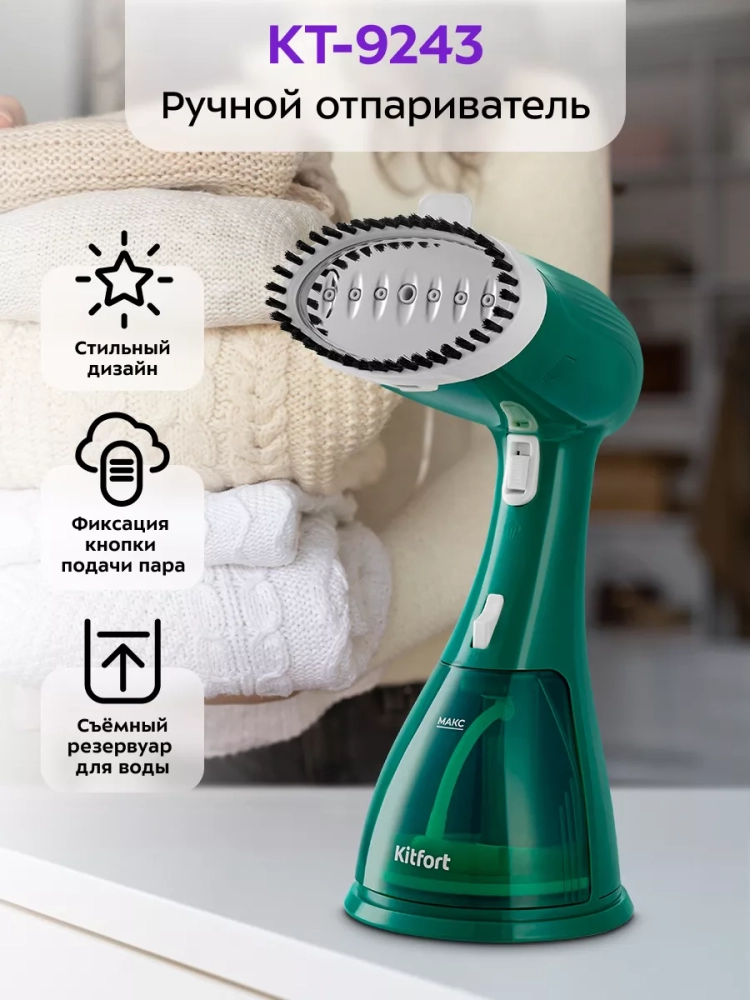 В отпаривателе КТ-9243 управление подачей пара осуществляется с помощью одной кнопки на ручке прибора. В комплекте предусмотрена ворсовая насадка, которая поможет очистить вещи от пыли, ворса, волос и шерсти домашних животных. Для удобства заполнения резервуара для воды в комплекте есть мерный стакан.