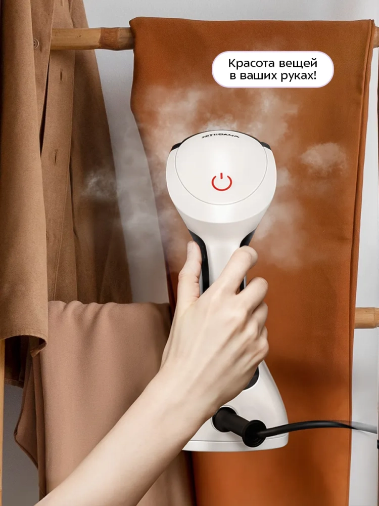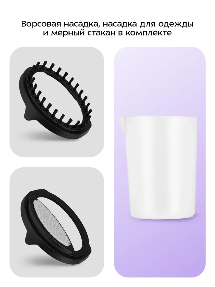 Шнур отпаривателя оснащен защитой от перегиба, что увеличивает срок службы прибора. В комплекте предусмотрены насадка для одежды и ворсовая насадка, которые помогут очистить вещи от пыли, ворса, волос и шерсти домашних животных. Для удобства заполнения резервуара для воды в комплекте есть мерный стакан.