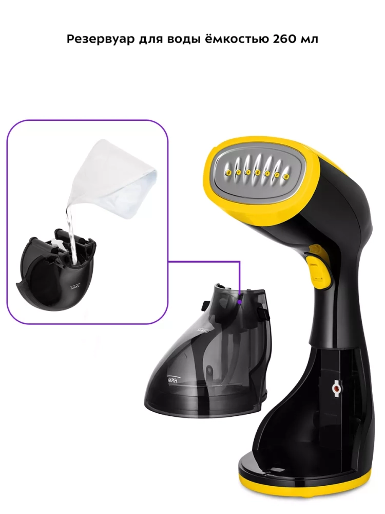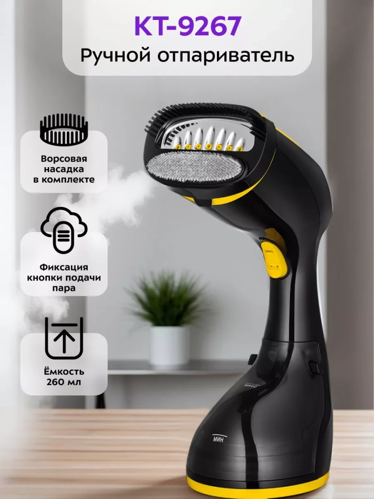 В отпаривателе КТ-9267 управление подачей пара осуществляется с помощью одной кнопки на ручке прибора. Шнур отпаривателя оснащен защитой от перегиба, что увеличивает срок службы прибора. В комплекте предусмотрена ворсовая насадка, которая поможет очистить вещи от пыли, ворса, волос и шерсти домашних животных. Для удобства заполнения резервуара для воды в комплекте есть мерный стакан.