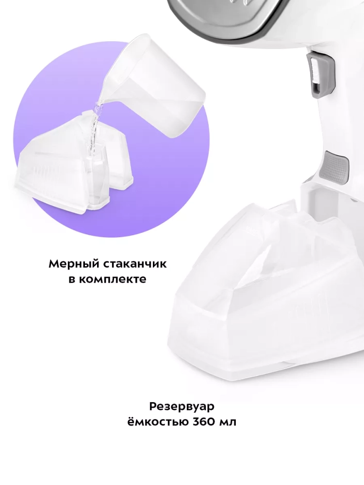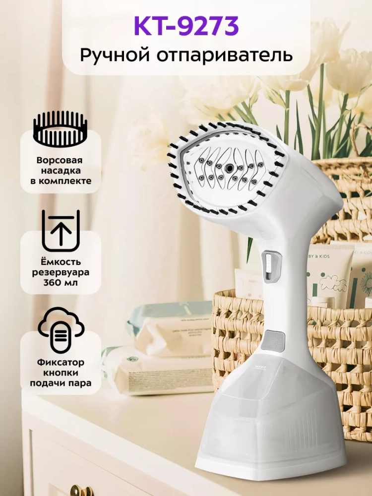 У отпаривателя КТ-9273 простое управление двумя кнопками. В комплекте предусмотрена ворсовая насадка, которая поможет очистить вещи от пыли, ворса, волос и шерсти домашних животных. Для удобства заполнения резервуара для воды в комплекте есть мерный стакан. Шнур отпаривателя оснащен защитой от перегиба, что увеличивает срок службы прибора.
