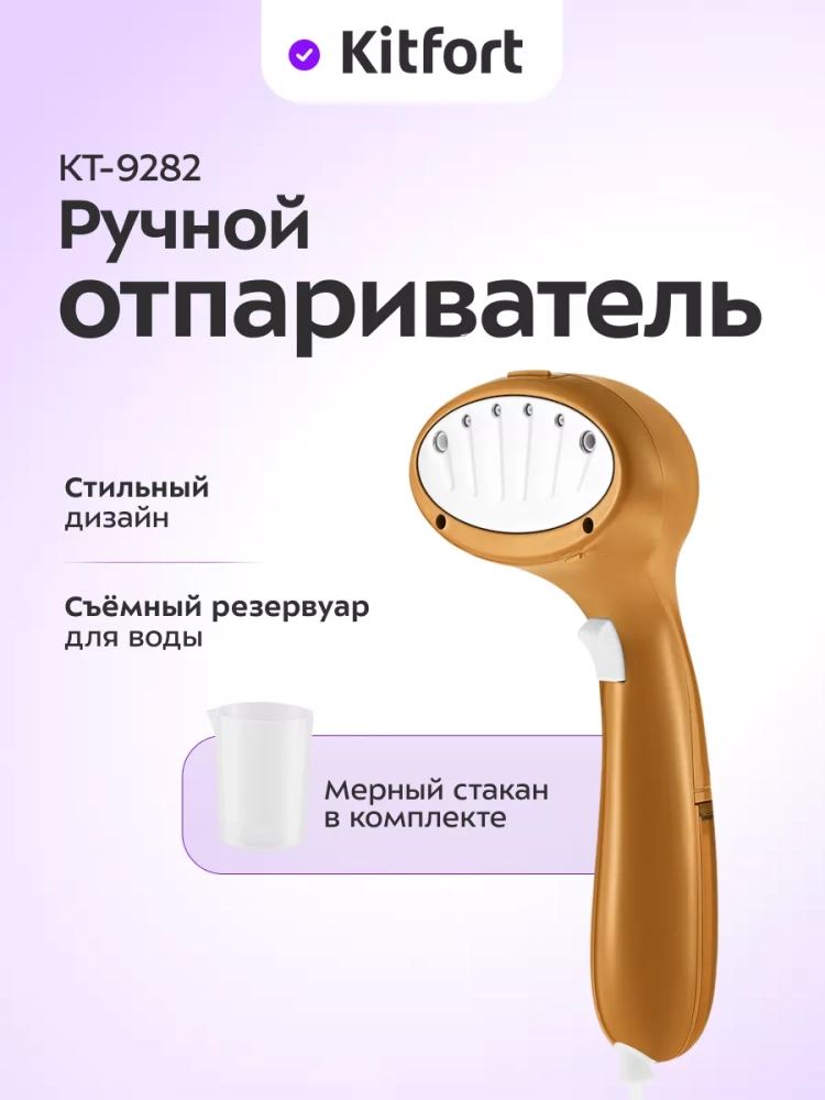 В отпаривателе КТ-9282 управление подачей пара осуществляется с помощью одной кнопки на ручке прибора. Для удобства заполнения резервуара для воды в комплекте есть мерный стакан.