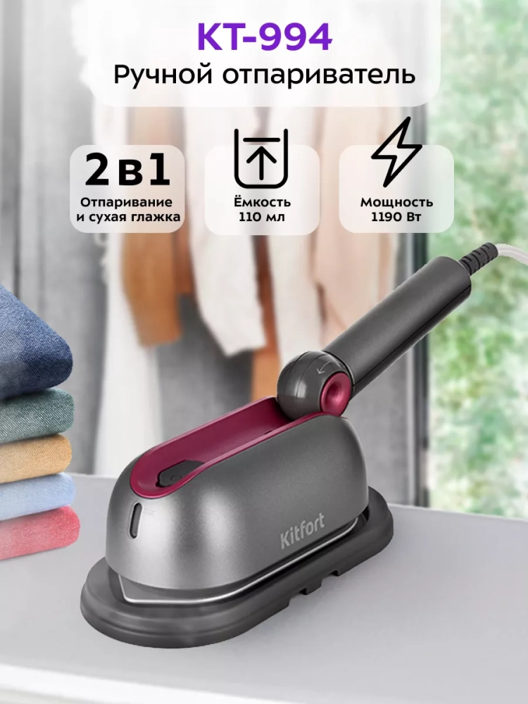 Отпариватель — устройство для разглаживания изделий из текстиля с помощью потока горячего пара. Ручной отпариватель Kitfort «2 в 1» КТ-994 обладает такими достоинствами, как: стильный дизайн, компактность и многофункциональность. Его удобно брать с собой в дорогу, путешествия, загородные поездки, командировки и даже на работу, если вы не успели погладить пиджак. Благодаря складывающейся ручке он будет занимать меньше места в чемодане или на полке.