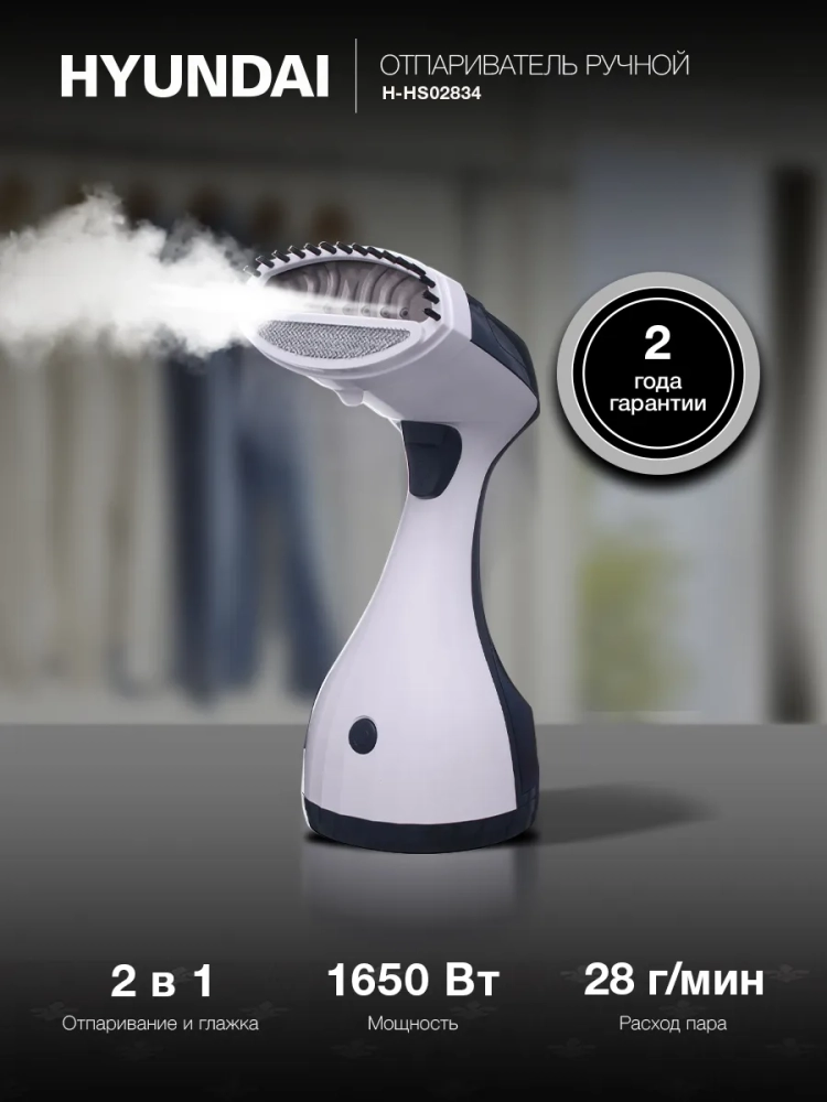 Отпариватель ручной Hyundai H-HS02834 белый/синий, мощность 1650Вт, в комплекте Насадка-щетка